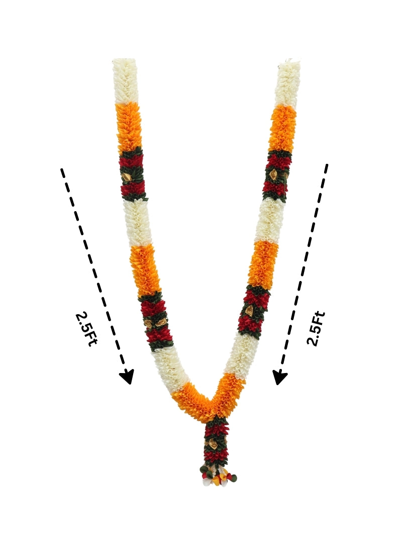 Add a touch of color and festivity to your home, pooja room or wedding decor with this 5ft artificial garland. Featuring white and orange flowers with red and green floral highlights, it brings a cheerful and elegant vibe to any space.