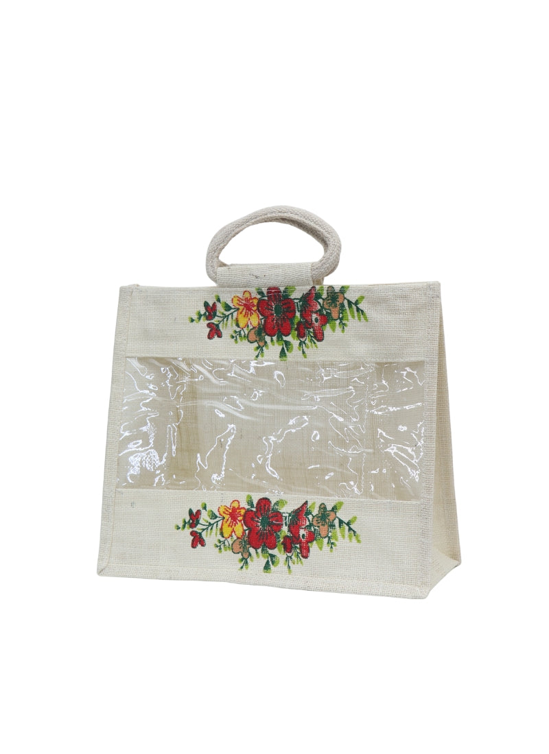 Add a touch of elegance to your lifestyle with this Floral Printed Jute Bag. This bag is not only durable but also environmentally friendly. The vibrant floral print adds a charming and refreshing look, making it ideal for gifting, shopping, or pooja return gifts. Featuring a transparent front panel, this jute bag lets you showcase its contents neatly while maintaining a stylish appearance.