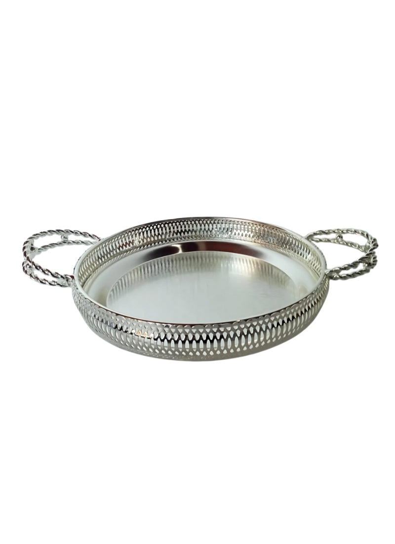 Add traditional charm and practical elegance to your home or special event with this 12-inch German Silver Round Metal Tray. Perfect for serving pooja offerings or fruits, it also brings a festive and refined look to your dining table, pooja room or living space. Ideal as a return gift for weddings, festivals or celebrations, it combines style with everyday functionality. Its round 12-inch design is perfect for daily use, gifting or festive décor, adding a sophisticated and elegant touch to any occasion.