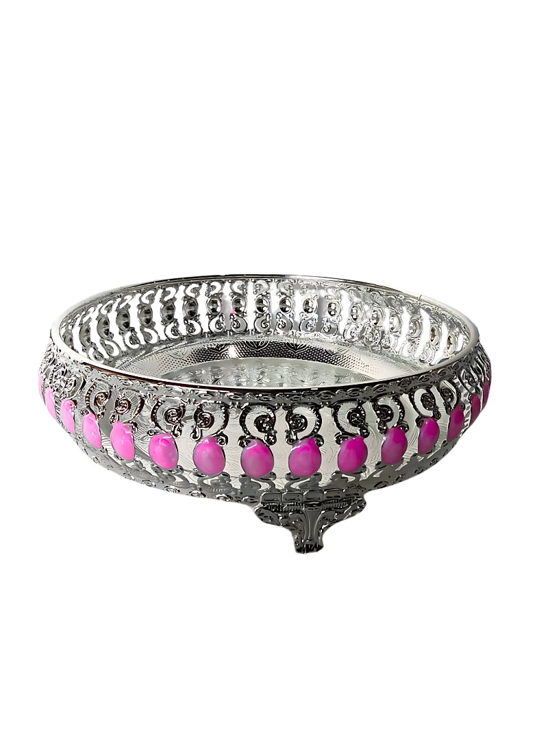 Delight your guests with the German Silver Tray Pink 10', a stylish and traditional accessory perfect for return gifts, pooja rituals, or festive celebrations. Its vibrant pink accent and polished German silver finish make it an eye-catching addition to any home, adding charm to pooja rooms, dining tables, or gifting occasions. Its elegant design ensures it is both practical and decorative, making it a thoughtful gift for festivals, weddings, housewarmings or special events.