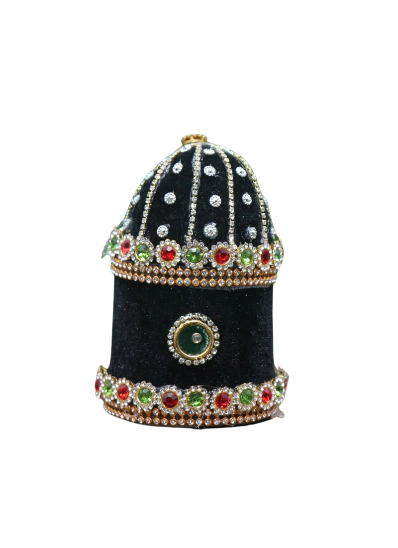 Enhance the divine beauty of your Goddess idol with this 4-inch Decorative Hair Bun (Jadai Ornament), beautifully handcrafted with stones, pearls, and golden embellishments. Designed in a dome-shaped traditional style, it adds a royal and graceful charm to your deity during Navaratri, Varalakshmi Vratham, temple festivals, and special pooja decorations. The elegant black velvet base highlighted with red, green, and white stones reflects classic South Indian temple artistry, making it a perfect fit for any Devi Alankaram setup.
