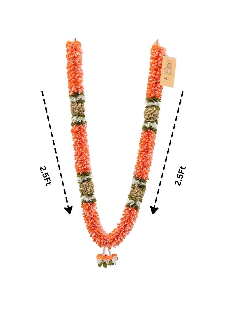 Add a vibrant and festive touch to your home with this 5-ft orange artificial garland, adorned with golden and green floral accents. Perfect for pooja rooms, living spaces, doorways or celebration corners, it brings warmth, traditional charm and cheerful vibes to any setting. Ideal for festivals, weddings, home decoration and even as a thoughtful return gift.