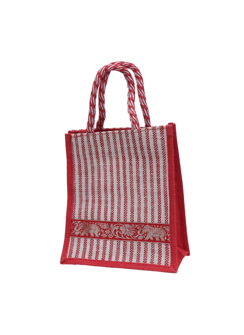 Carry tradition with a modern touch using this Red Vertical Striped Jute Bag. Designed with elegant red and white woven stripes and an intricate golden elephant border, this eco-friendly bag is both durable and fashionable. Perfect for daily use, shopping, gifting, or carrying pooja items.